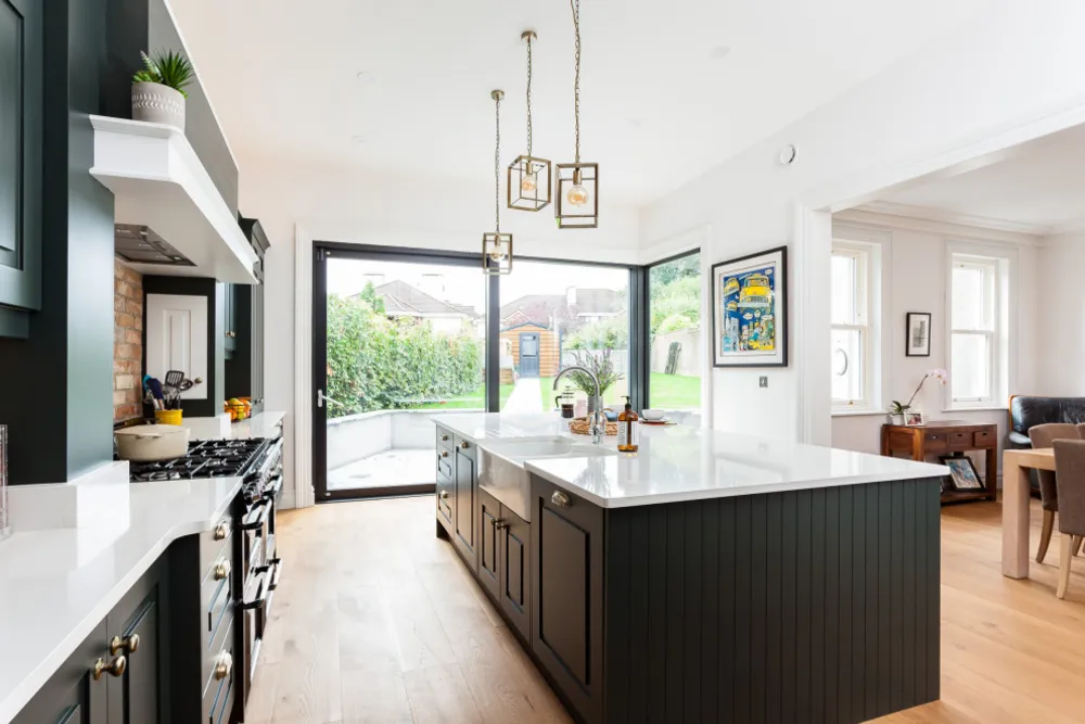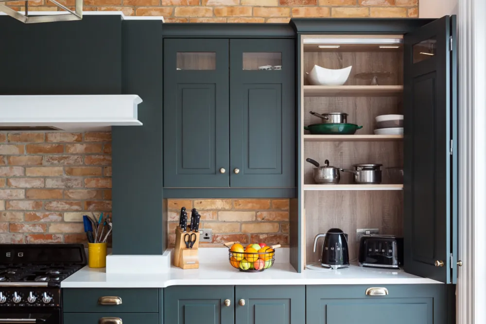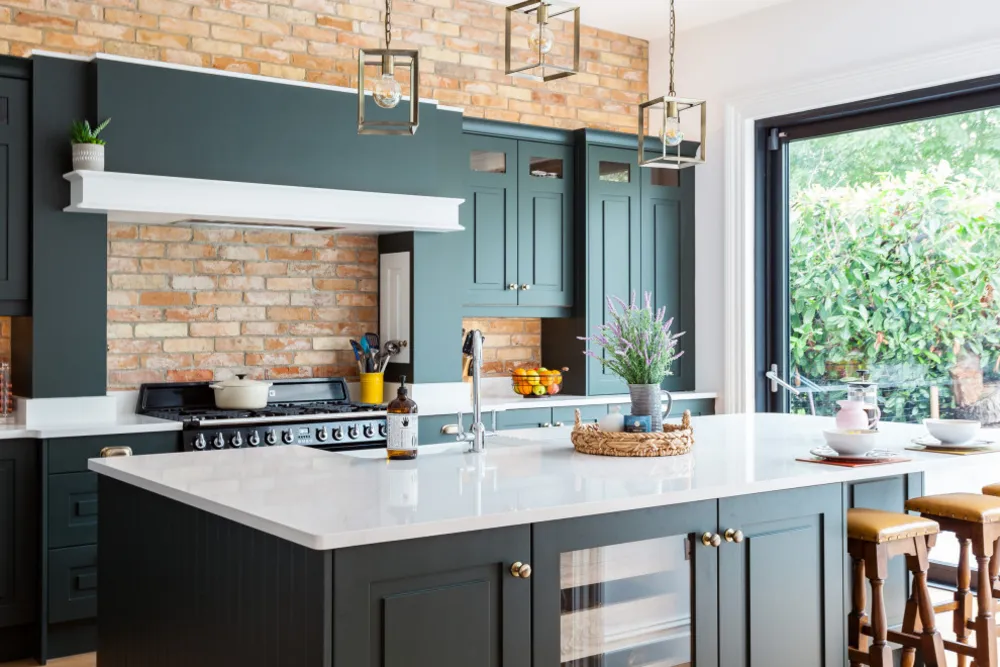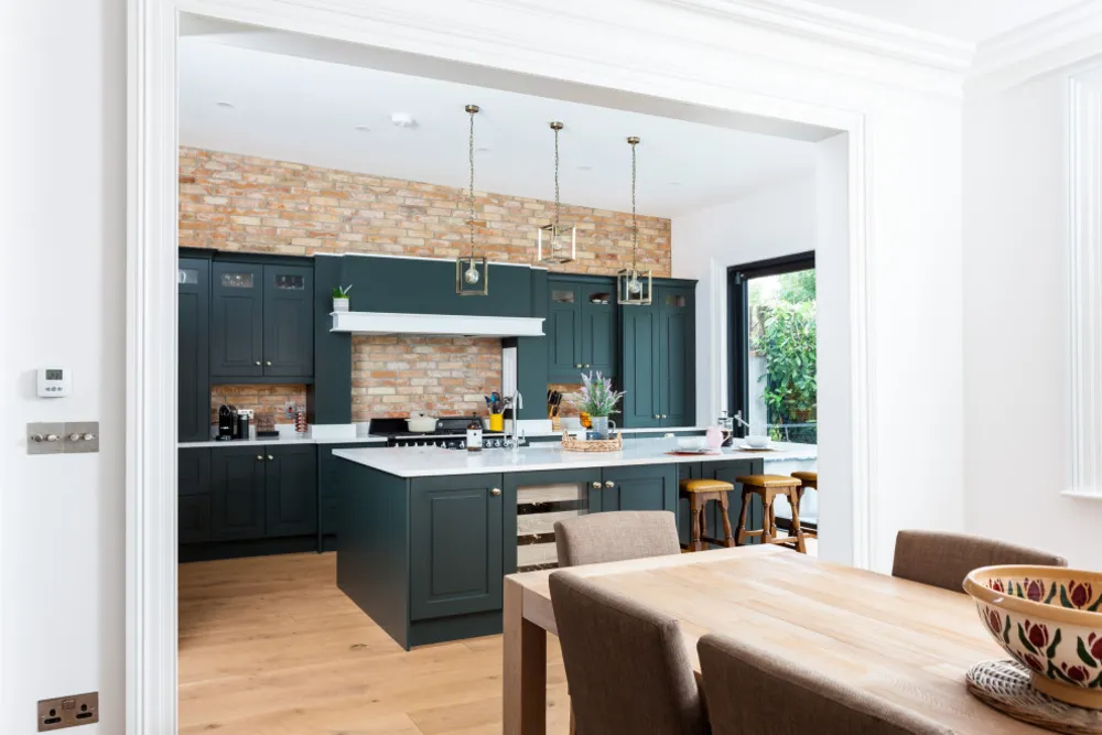 Dunkelgrüne Schränke verleihen einer einladenden Küche Eleganz