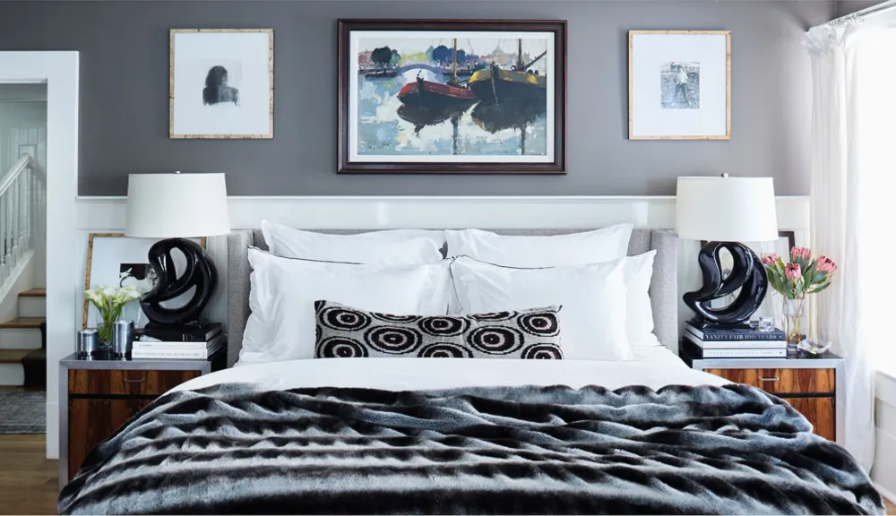 Olohuone.Takka, päällystetty paikallisella Napa Chip (tunnetaan myös nimellä Napa Cobble) ankkuroi mukavan istuvuuden keittiön vieressä oleva alue. Kuten talon rakennusaikana oli tyypillistä, huoneet olivat pieniä ja suljettuja toisistaan. "Ajatus oli murtaa julkisten tilojen seiniä alas", Urrutia sanoo. "Tämä myös antoi luonnonvalon virrata huoneesta toiseen." Patchwork lampaannahkainen matto ja Minotti-sohvapöytä: 1stdibs; mukautettu sohva: Urrutia Design; suurempi maisema taideteos: ; pienempi maisema taideteos: Granville Redmond Olohuone. Valmistettu antiikkipöytä meksikolaisen laivan puusta korostavat pientä asumista huoneeseen. "Seinien murtaminen julkisissa tiloissa on aina avainasemassa menestystä", Urrutia sanoo. "Se mahdollistaa huoneiden fyysisen ja visuaalisesti yhdistetty. Ja voit aina käyttää ylisuuria taskuovia jos haluat saada mahdollisuuden sulkea huoneet yhteen toinen." Tilaussohva: Urrutia Design; Bling-kruunu: Robert Abbey; maisemakuva: Master makuuhuone.Makuuhuoneessa kuviot ja sävyt ovat muistuttaa myrskyisää merta. Woodcliff Laken seinämaali: Benjamin Moore; Wyatt-sänky: Huone ja Hallitus
