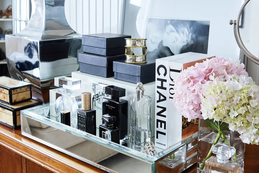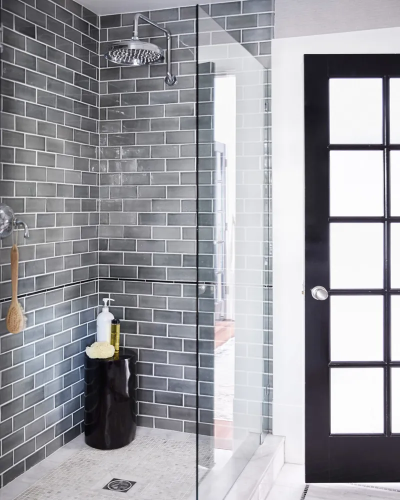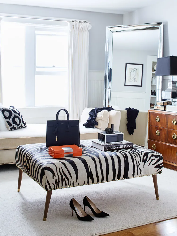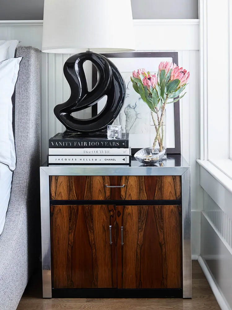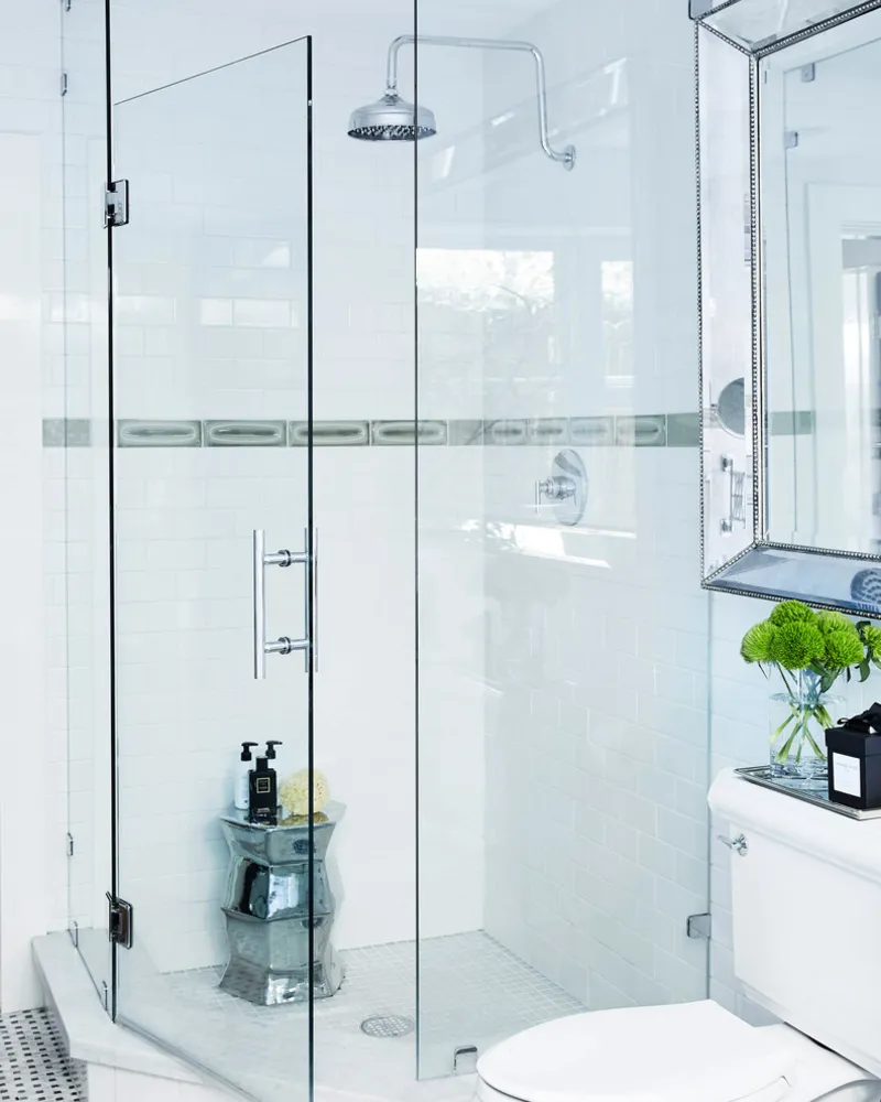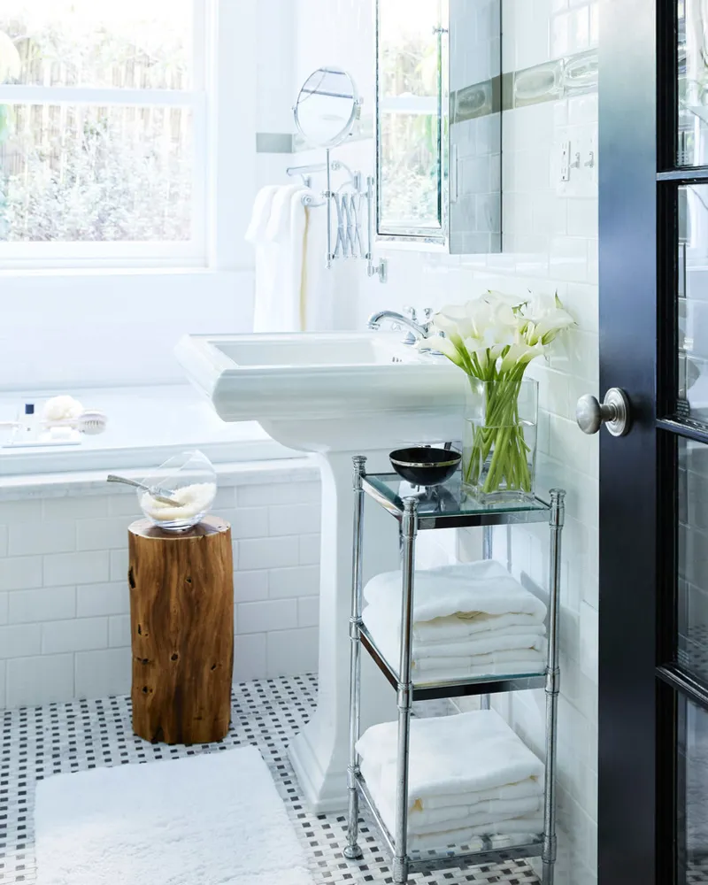 Suuri biomorfinen pöytälamput ruusupuulla ja kromi yöpöytä onnistuneesti uhmata normaaleja mittakaavasääntöjä. Yöpöydät ja lamput: 1stdibs Räätälöity penkki ja ottomaanit, molemmat Urrutian suunnittelemat, sopivat pukeutumistilaan makuuhuoneen aurinkoiseen nurkkaan. Midcentury lipasto: Lane Furniture Carvalho's tuoksukokoelma koristaa lipaston yläosaa. Master kylpyhuone.Urrutia ja Carvalho työskentelivät läpi kodin saavuttaa estetiikka, joka oli perinteinen, nykyaikaisella kierre. Urrutia kuvailee sitä "paljon metrolaattoja, valkoista Carraran marmoria, mustaa [Nero Marquina]graniittia … kanssa hieman nykyaikainen hana tai valaisin sekoitettu tähän ja siellä." Newburyn pieni etagere ja kehystetty lääkekaappi: RH Täyslasi kotelo avaa pienen suihkutilan. Stellar-kokoelman seinälaatta, puhdas valkoinen: Sonoma Tilemakers; soikea vihreä laatta: (väri ei ole enää tuotannossa)