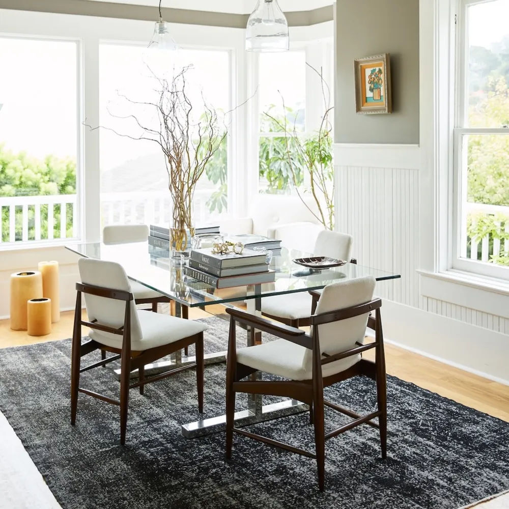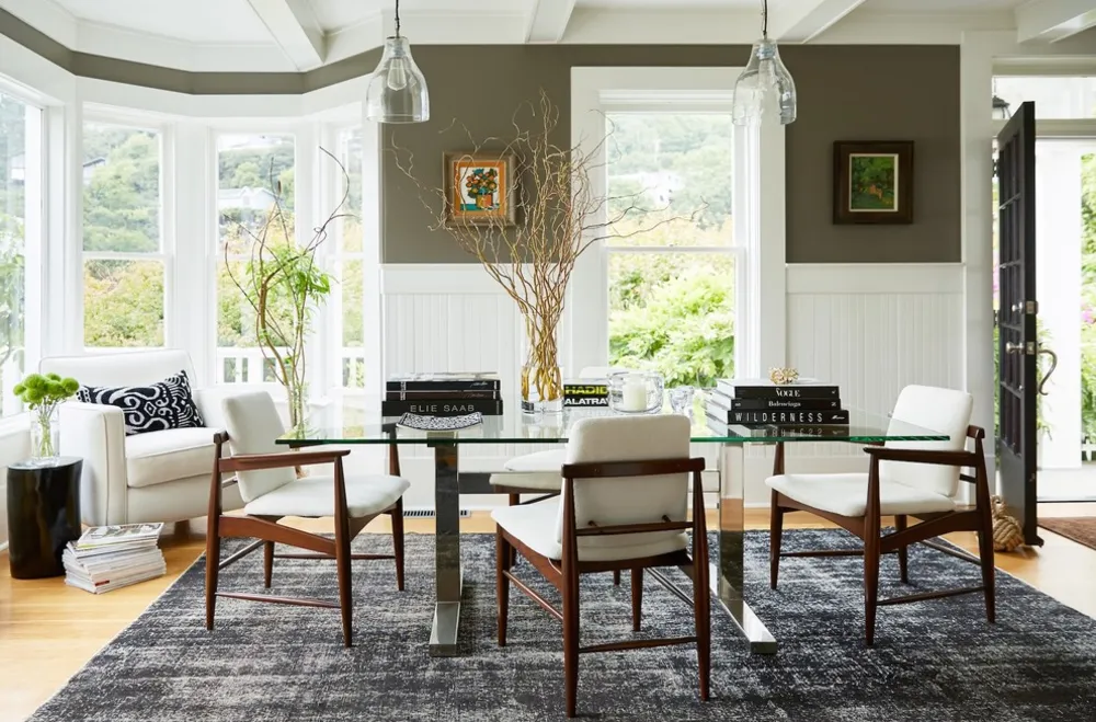 Ruokailu.The ruokailuhuone, aivan kodin eteisen sisäänkäynnin vieressä, on lahti ikkunoista, joka avaa kodin näkymät ympäristöön kukkulat. Mittatilaustyönä verhoiltu tuoli tarjoaa paikan hyödyntää auringonvalolta ja kodinomistajan vintage-tuoleja kokoelma ympäröi lasipöytää, joka pitää tilan avoimena ja kirkas.