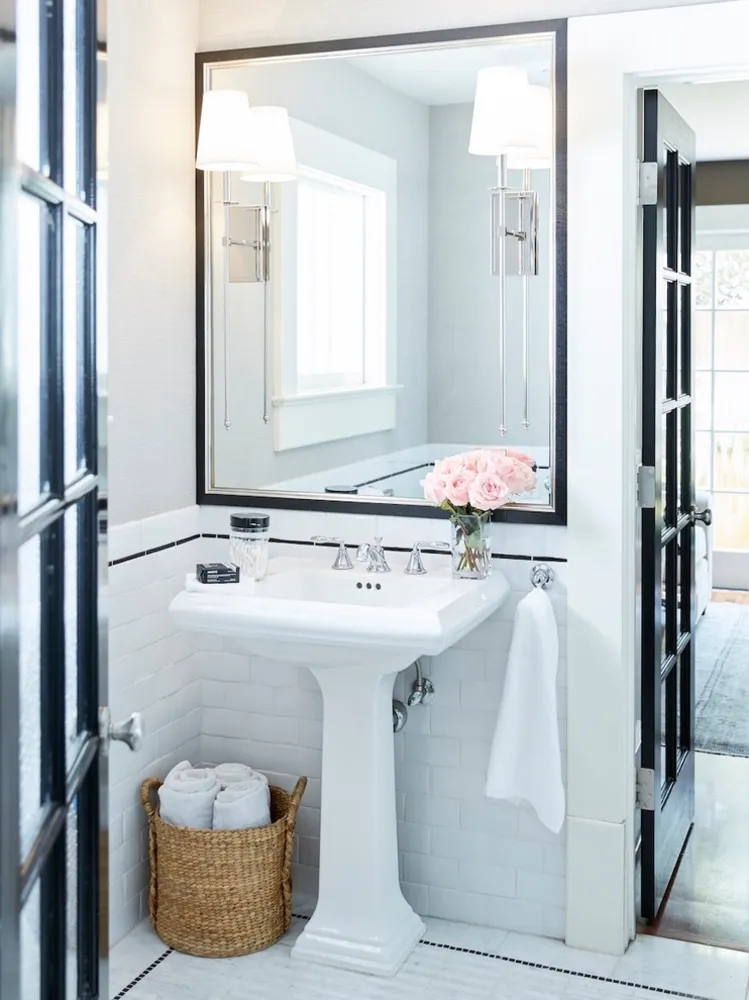 Pyykki huone. Kiiltävä musta ovi ja vastaava metrolaatta hienostuneisuutta pesutupaan. Ctaso on hiottu Valkoinen Carraran marmori. Stellar-kokoelman seinälaatta Night Fall -kiiltossa:Sonoma Tilemakers; pesukone ja kuivausrumpu grafiittiteräksestä: LG Vieras kylpyhuone. Lamput asennettu ylisuuren mukautetun peilin päälle tuo lisävaloa vieraskylpyhuoneeseen. Suprema Gloss -seinälaatta Crystalissa Valkoinen:;Muistimien jalustaallas: Kohler; Monroe yksivalolamppu: Horchow; mukautettu peilikehys:Versailles 112045,Roma Moulding; Seabury-hana: Grohe Tummemmat harmaat laatat Vierassuihkussa lisää painovoimaa valoisaan tilaan. The lattialaatat ovat valkoista Carraran marmoria. Suprema Gloss -seinälaatta Slatessa: California Art Tile; suihku kalusteet: Kohler Etusivu toimisto. Talon yläosassa on kruununjalokivi: kodin omistajien suunnittelustudio ja toimisto, josta on koskemattomat näkymät. Valaisin: Etsy; Mercer-pöytä: Williams Sonoma Home; sininen sametti midcentury tuolit: ; ylivärjätty matto: Kilim Puuteri huoneeseen. Kirkkaat valkoiset ja kromiviimeistelyt kontrastivat tumman kanssa kuvioitu tapetti pesuhuoneessa. Työtaso on hiottu valkoista Carraran marmoria. Soho Hemp 5281 taustakuva mustavalkoisena: ; Cortlandin lamppu: Hudson Valley valaistus; Mario peili: Äärimmäinen; Art Deco -konsoli pesuteline: Signature Hardware; Kathrynin alla oleva pesuallas lasitettu alapuoli: Kohler; Lombardia hana: Rohl; lattia: kiillotettu arabeskivalkoinen Carraran marmori: Rakentaja Varasto Takaisin patio.Takaoven ulkopuolella on rauhallinen paikka levätä ruukkukasvien joukossa. Moruya merilaipiovalaisin: ; Ravello teak tuoli: Maisemasuunnittelu: Urrutia Design Rakennusinsinööri: Chuck Utzman Putkityöt: Medina Putkityöt Sähkö: Canning Electric Sadettimet: Sinclair Plumbing |||||||||||